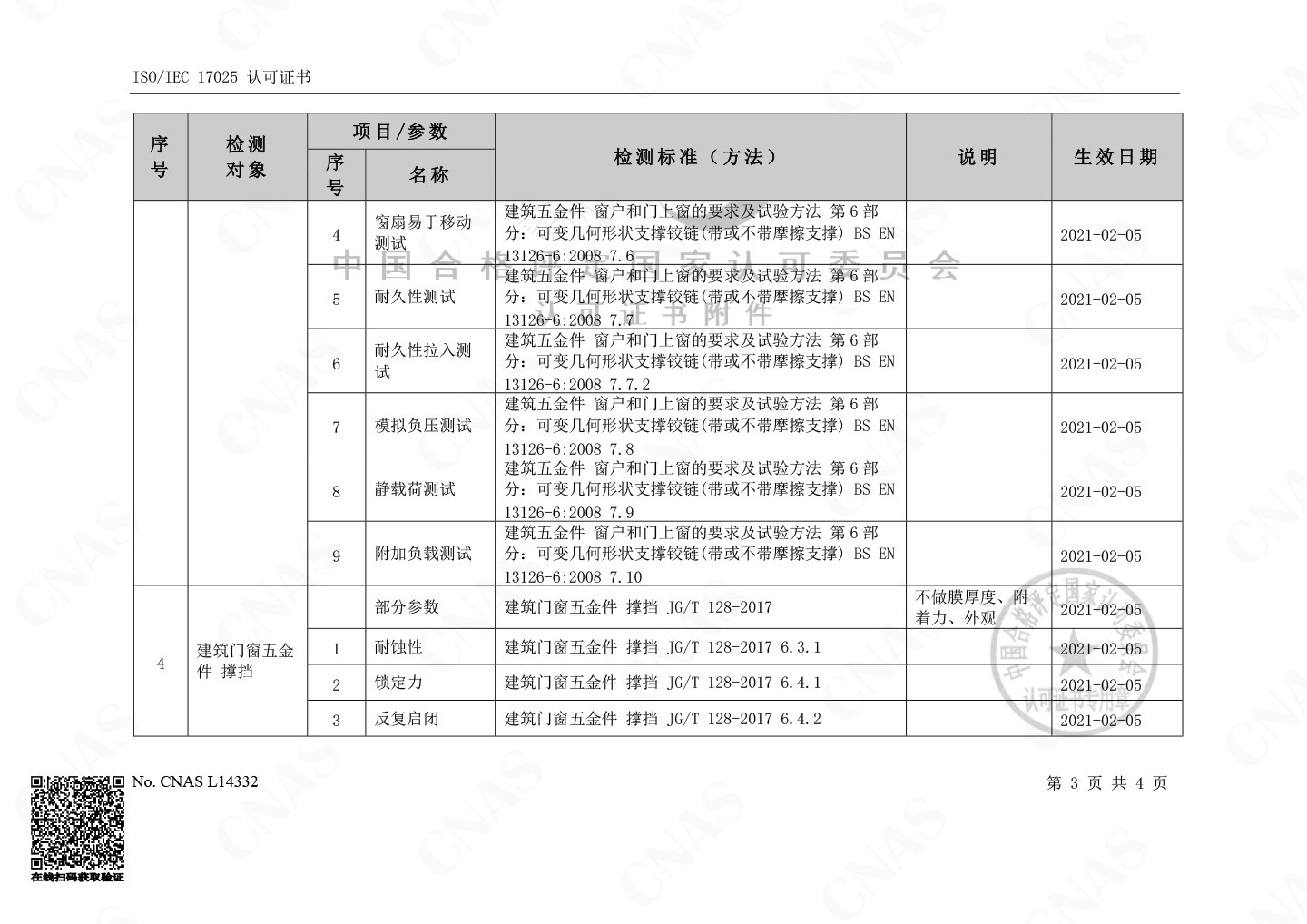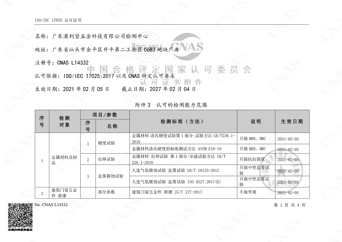 红桃国际检测中心聚集建筑门窗五金滑撑、撑挡及金属材料机械性能及物理性能检测,认可涉及的检测能力包含4个检测对象,23个检测项目。测试中心现有人员7名,高级工程师1名,博士1名,专科学历以上人员5名,均具备多年技术检测经验,参与多项建筑工业行标起草及验证工作。拥有不锈钢滑撑铰链试验机、电子万能拉力机、洛氏硬度计、精密型盐雾试验机、电子分析天平等检测设备,全面满足认可检测能力范围内的检测项目。